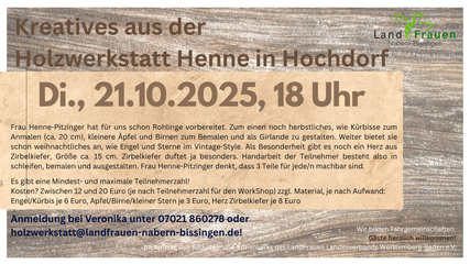 Anmeldung bei Veronika unter 07021 860278 oder holzwerkstatt@landfrauen-nabern-bissingen.de!
